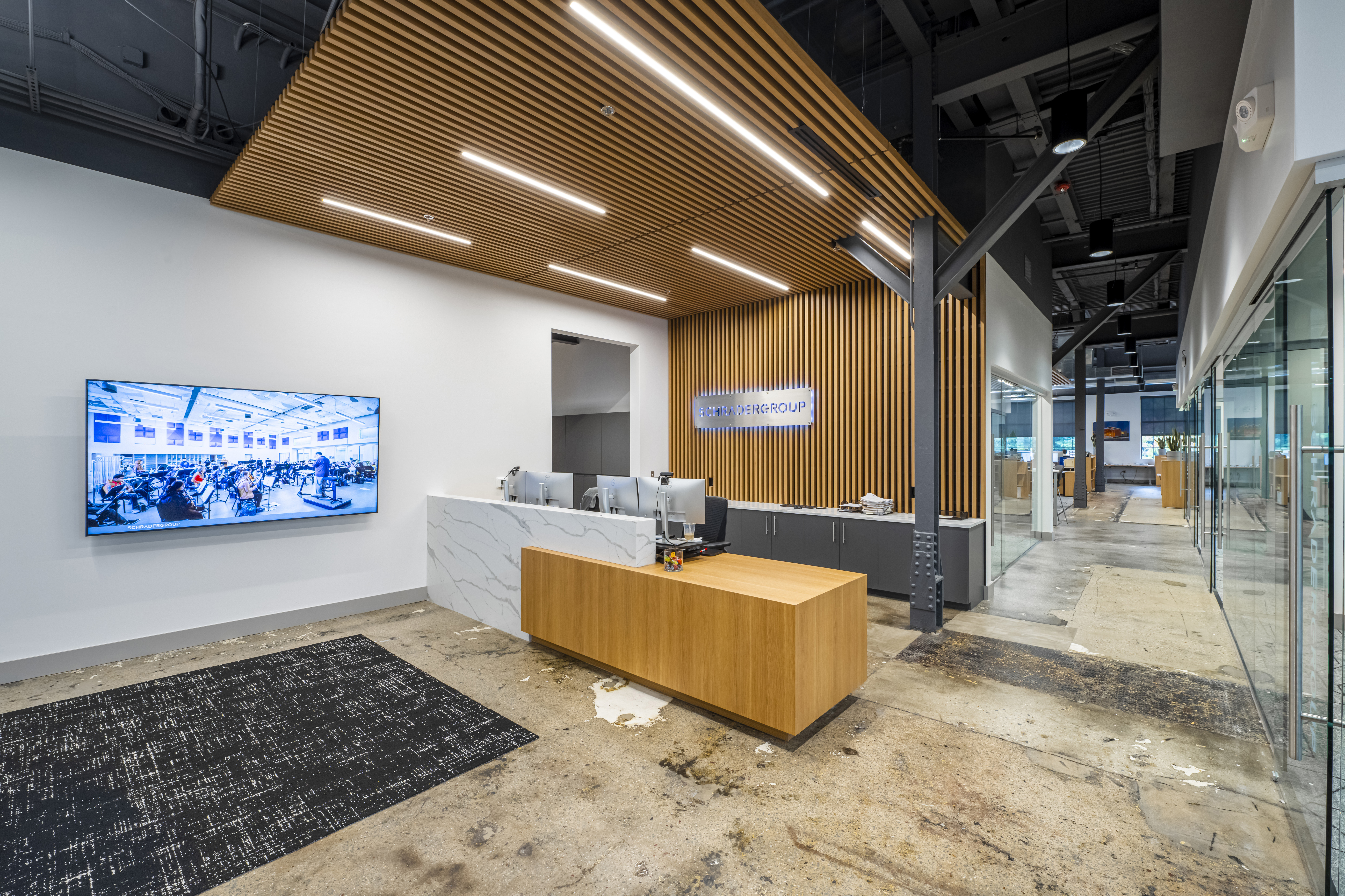 SCHRADERGROUP (SG), an architectural and engineering design firm, needed help integrating collaboration solutions in their new office space. The goal was to incorporate advanced solutions that were visually appealing and created an impact for visitors, clients, and employees.