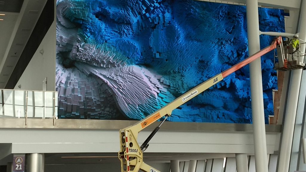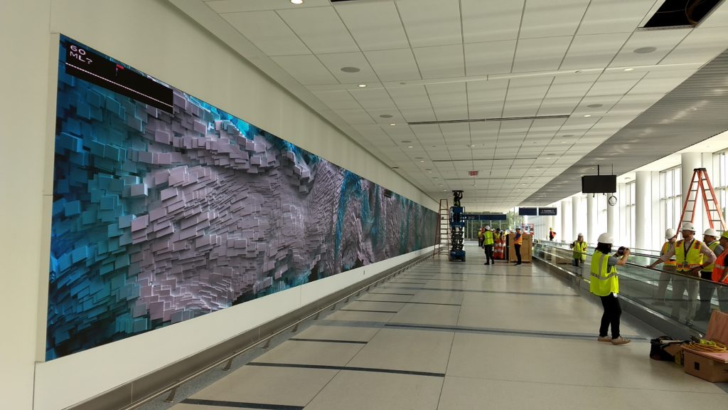 Cenero worked to create large LED Video Walls as part of the $200 million 23,000 square foot expansion of Concourse A of the Charlotte Airport. The impressive 10 feet high and 140 feet long LED wall as well as two 40 feet video walls feature digital artwork from artist Refik Anadol. The art is described as dynamic abstract visualization, turning operational data from the airport such as arrivals, departures, destinations, baggage claim and more into abstract form, color and simulated texture that moves across the screens.