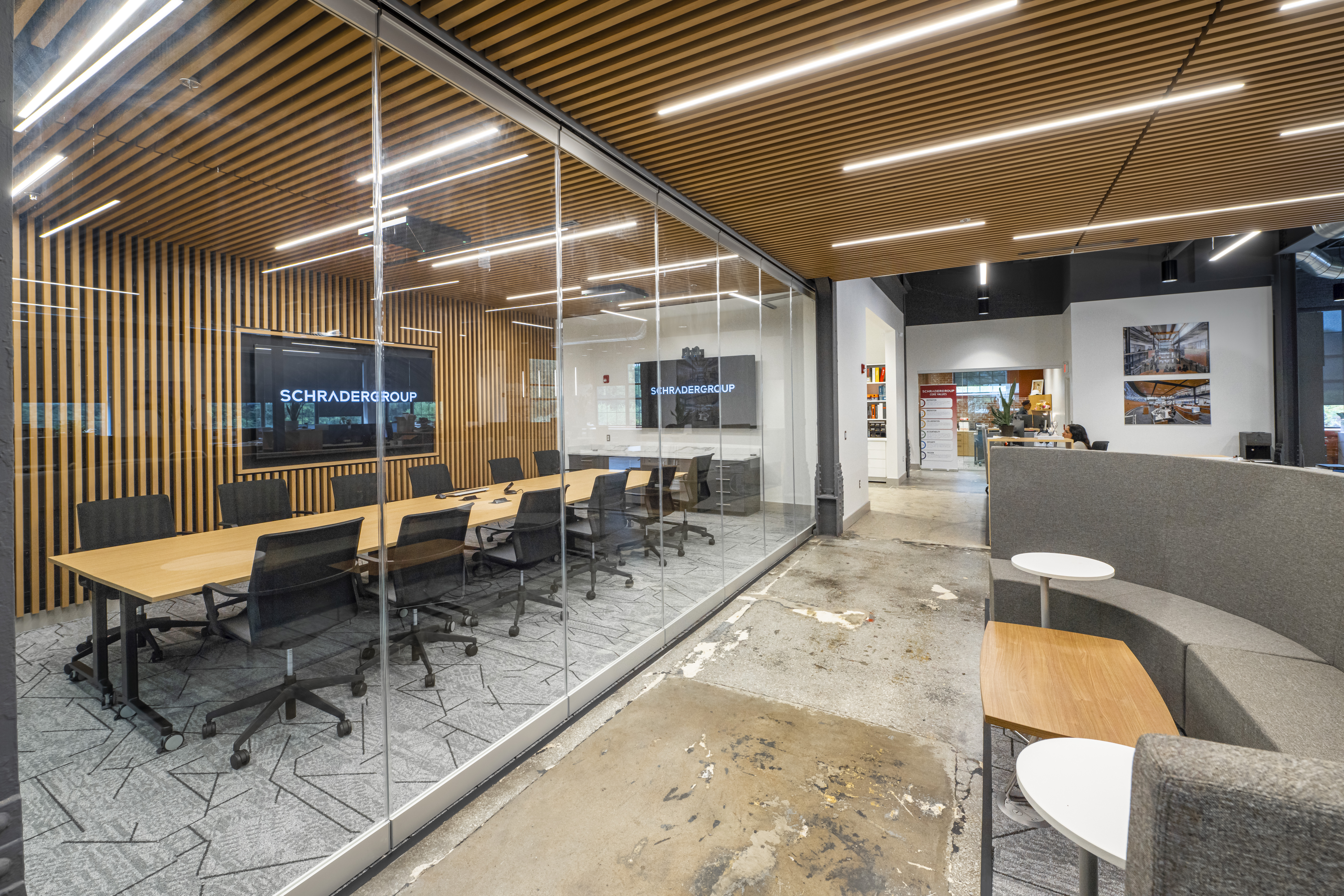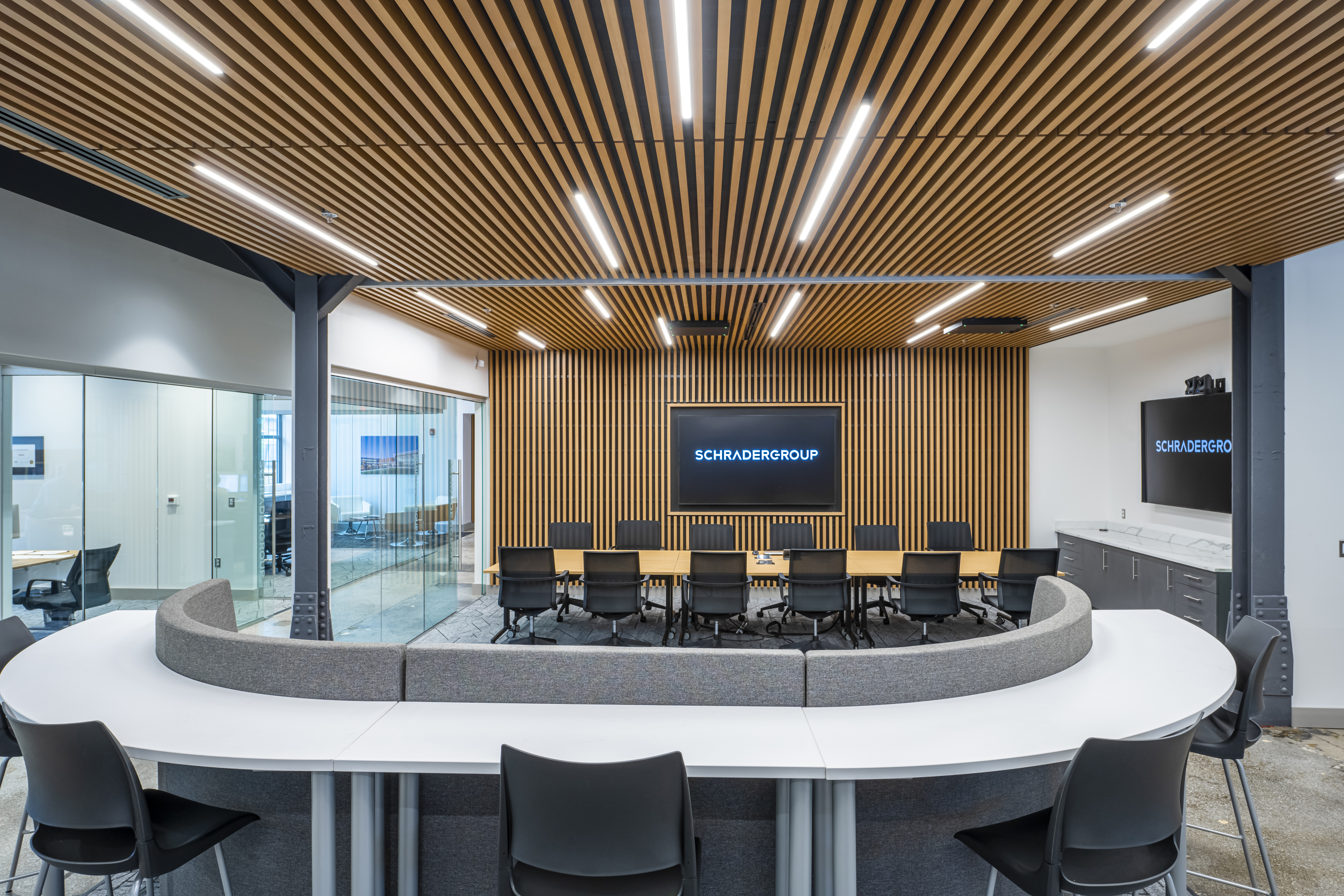 SCHRADERGROUP (SG), an architectural and engineering design firm, needed help integrating collaboration solutions in their new office space. The goal was to incorporate advanced solutions that were visually appealing and created an impact for visitors, clients, and employees.