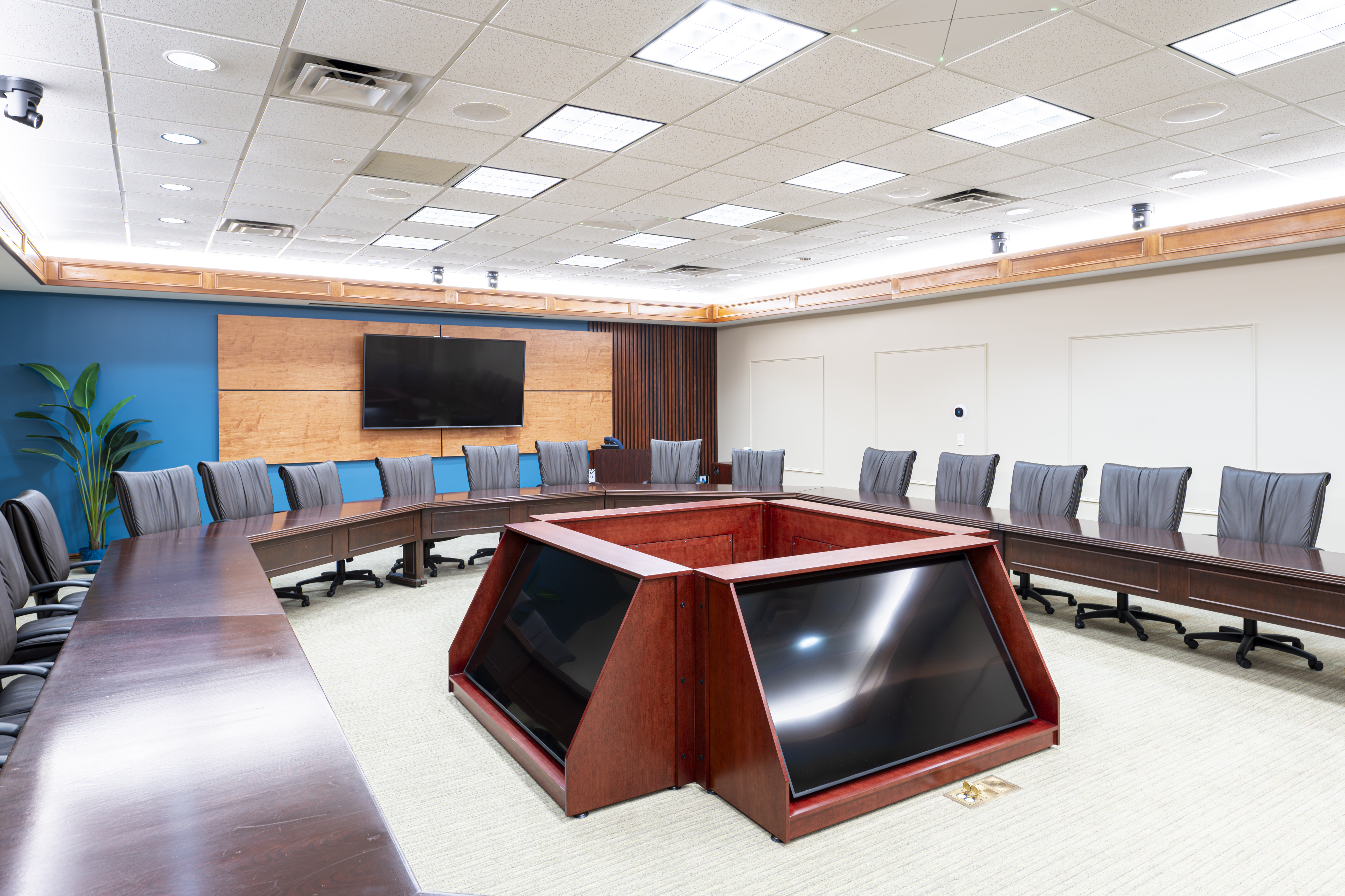 Cenero partnered with the Maryland Hospital Association to create sophisticated tech solutions for their meeting spaces that could work for a variety of use cases. For the boardroom, Cenero designed a center credenza that houses 4 displays to allow for visibility from every seat at the table. 8 cameras were installed so everyone could be seen clearly and also featured tracking capabilities to follow the presenter in the room. All solutions included BYOD capabilities, camera tracking, and audio pickup to create more immersive and engaging meeting experiences.