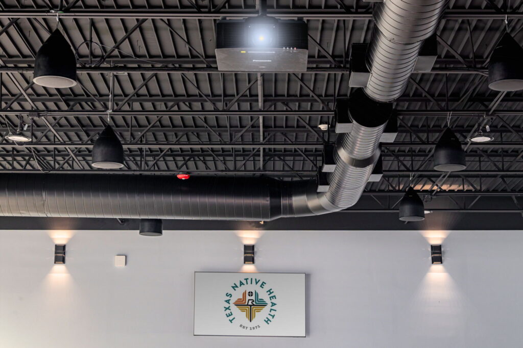 Texas Native Health, a non-profit organization providing services to support the Texas Native American community, needed a partner to help develop collaborative solutions for their multi-purpose area. The space needed to work for many types of use cases, and audio needed to extend to additional overflow areas throughout the office including the kitchen, lobby, and hallway.