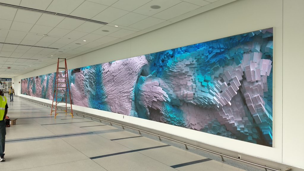 Cenero worked to create large LED Video Walls as part of the $200 million 23,000 square foot expansion of Concourse A of the Charlotte Airport. The impressive 10 feet high and 140 feet long LED wall as well as two 40 feet video walls feature digital artwork from artist Refik Anadol. The art is described as dynamic abstract visualization, turning operational data from the airport such as arrivals, departures, destinations, baggage claim and more into abstract form, color and simulated texture that moves across the screens.